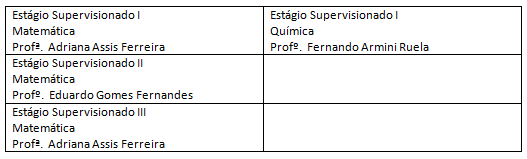Este espaço é comum aos três cursos de licenciatura. Física, Matemática e Química. Aqui vocês receberão instruções básicas de como preencher os documentos obrigatórios do estágio supervisionado. São eles: