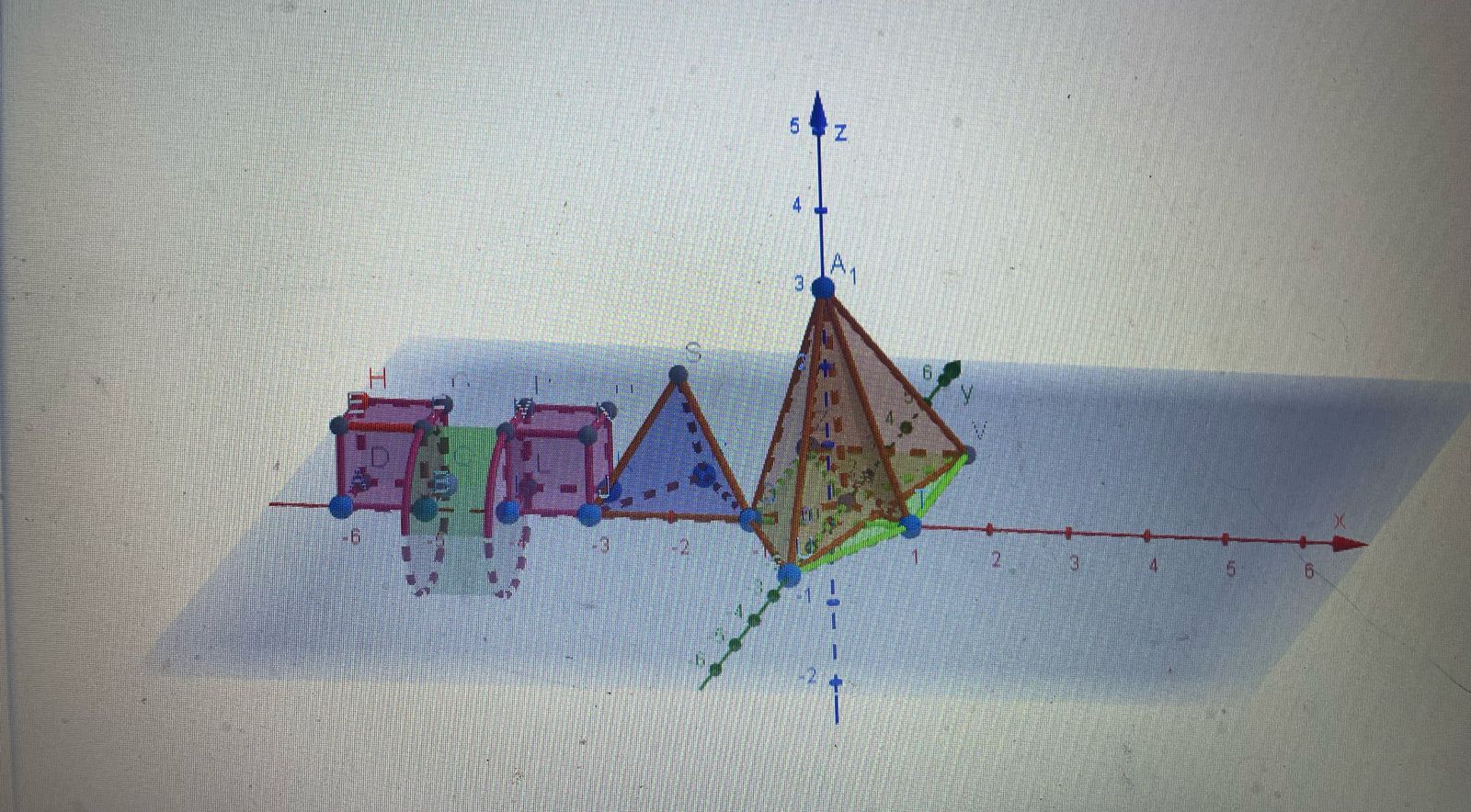 Toda a composição está inserida em um plano tridimensional, com os eixos X, Y e Z visíveis, o que reforça o uso da matemática espacial na construção. Os pontos, letras e cores ajudam a identificar partes da estrutura e tornam o projeto ainda mais didático e visualmente organizado.