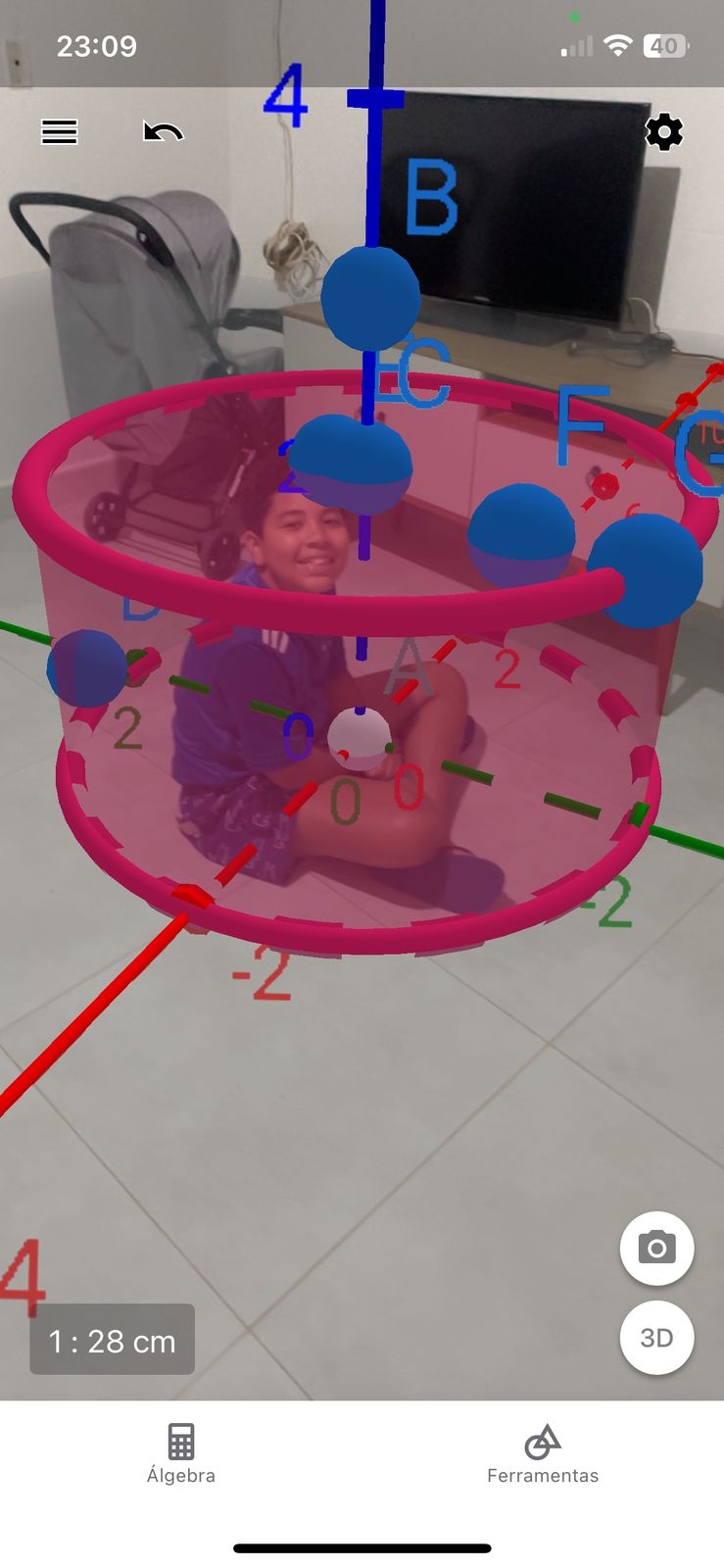 Nesta atividade, foi criada uma estrutura tridimensional no GeoGebra Calculadora 3D, utilizando o recurso de Realidade Aumentada (RA). A figura central é um cilindro vertical translúcido, construído no plano XY e projetado com altura e raio proporcionais, com marcações visuais nos eixos X (vermelho), Y (verde) e Z (azul), o que permite a leitura matemática do espaço.