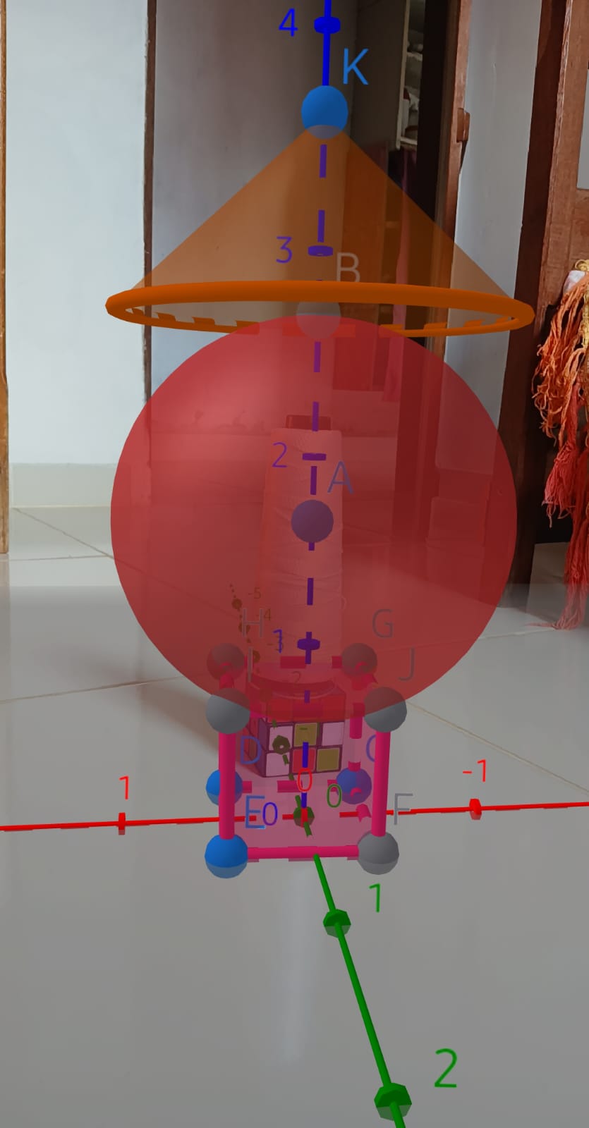 3. No topo da esfera: Acrescentei um cone laranja, com o vértice no ponto K, que dá a sensação de finalização da estrutura, como se fosse um telhado ou cobertura.