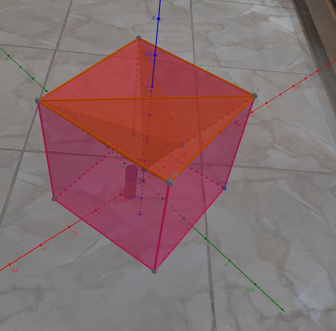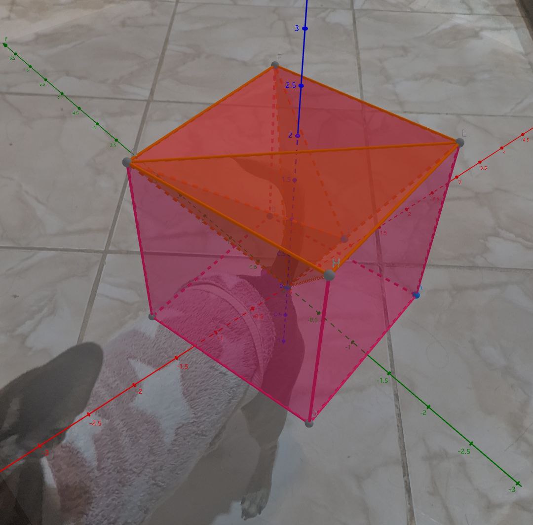 A minha construção no GeoGebra foi bem simples: elaborei um quadrado em 3D e, sobre ele, adicionei alguns triângulos, formando um prisma. Utilizei o método de panificação para permitir que a pirâmide posicionada sobre o quadrado geométrico pudesse se movimentar. 🟦🔺