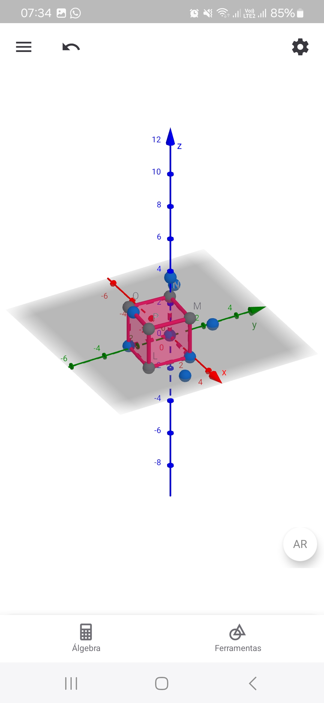 Foi construído um sólido geométrico (um cubo) no ambiente 3D do GeoGebra, e utilizou o modo de Realidade Aumentada (AR) para posicionar esse cubo sobre um fundo real, que neste caso é um piso de cerâmica em uma sala com móveis e objetos reais.