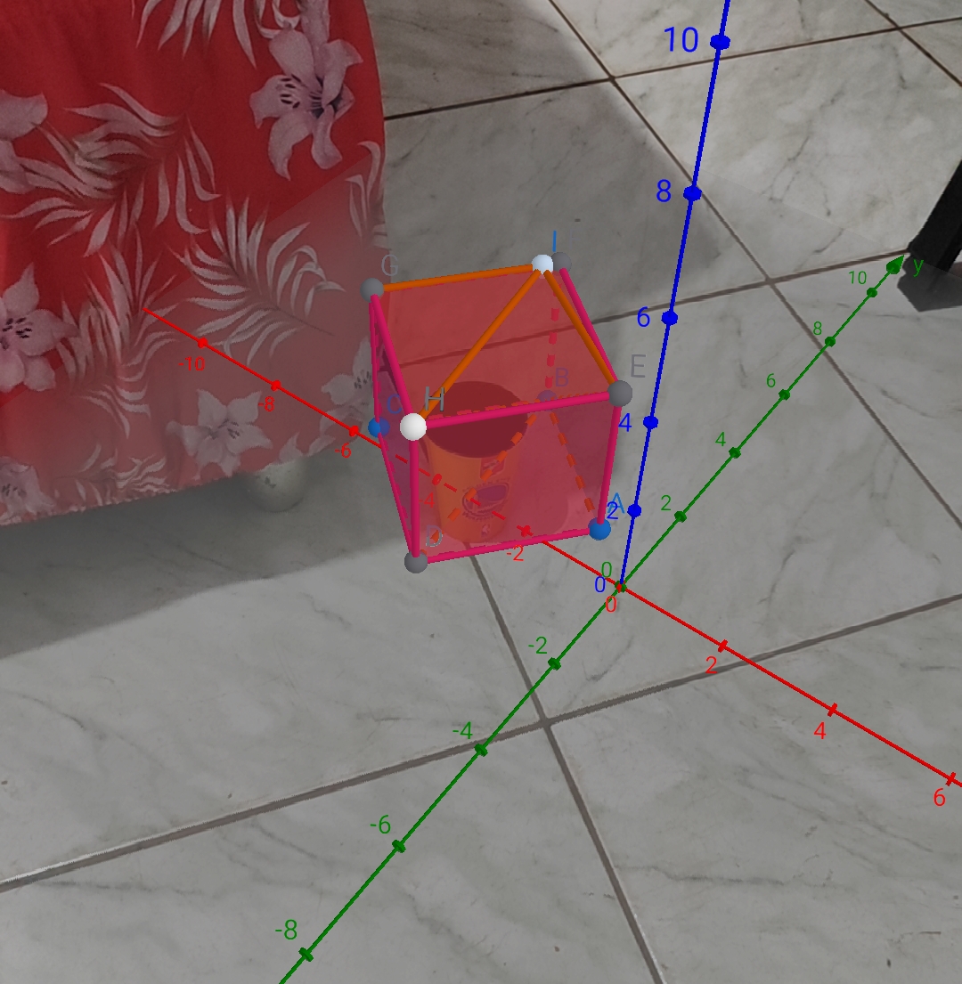 Criei um cubo e adicionei uma pirâmide de base quadrada externamente a ele .No interior da construção foi colocado um copo para que a construção ficasse mais criativa.